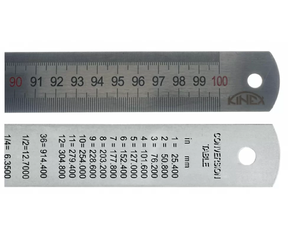 • Профессиональная стальная измерительная линейка Kinex с цветной шкалой, ценой деления 0.5 и 1 мм и размерами 1000x30x1 мм. Шкала нанесена при помощи лазерной маркировки. На обратной стороне линейки присутствует специальная пересчетная таблица.